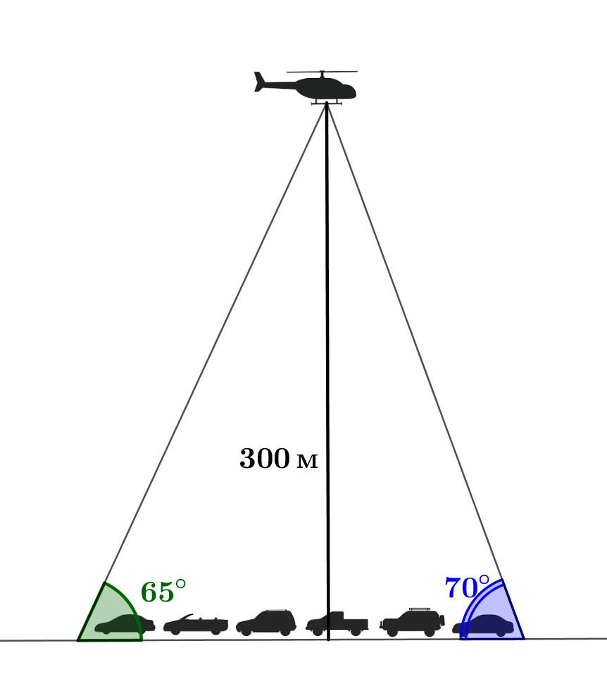 С вертолета, находящегося над шоссейной дорогой, была замечена двигавшаяся по ней колонна машин. Начало колонны видно под углом понижения \(\displaystyle 65^\circ\small,\) а конец – под углом \(\displaystyle 70^\circ\small.\) Найдите длину колонны в метрах, если вертолет находится на высоте \(\displaystyle 300\) м. Ответ округлите до целых.