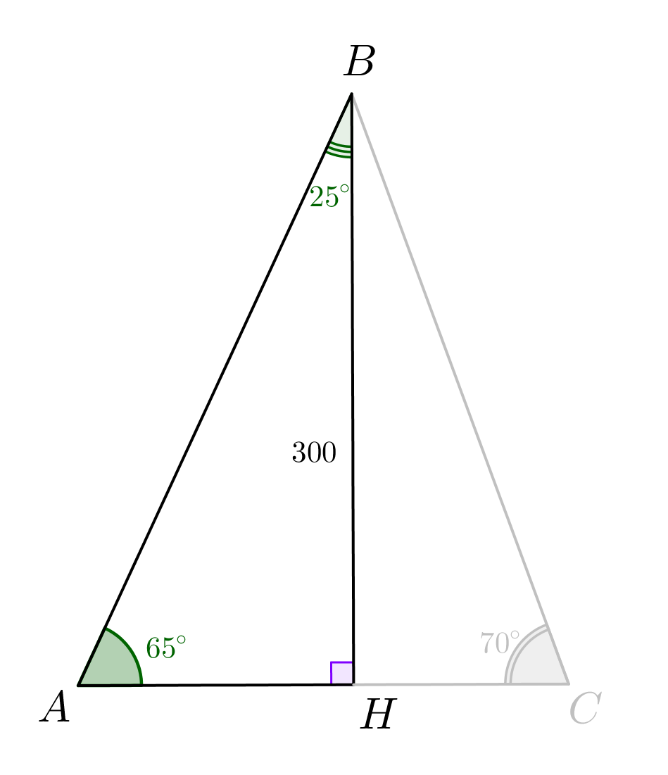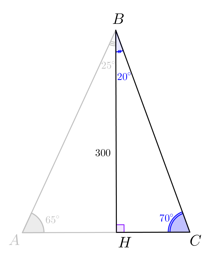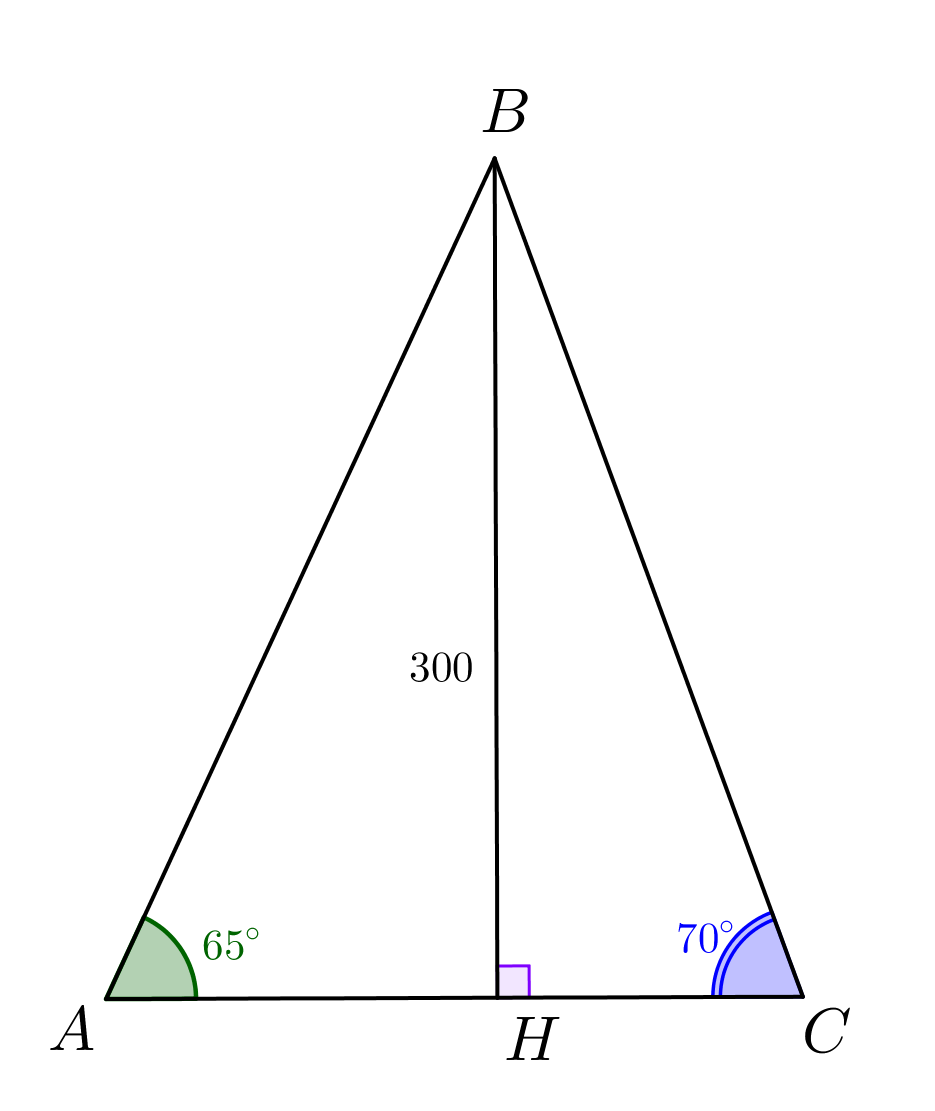 \(\displaystyle AC=AH+HC=\frac{BH}{\tg 65^\circ}+\frac{BH}{\tg 70^\circ}=\frac{300}{2{,}14}+\frac{300}{2{,}75}\approx 249{,}28\approx 249\small.\)