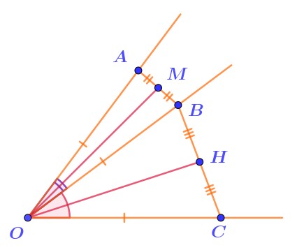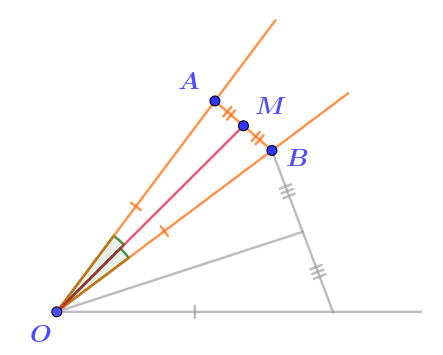 По свойству, \(\displaystyle OM\)– биссектриса треугольника \(\displaystyle AOB\), тогда