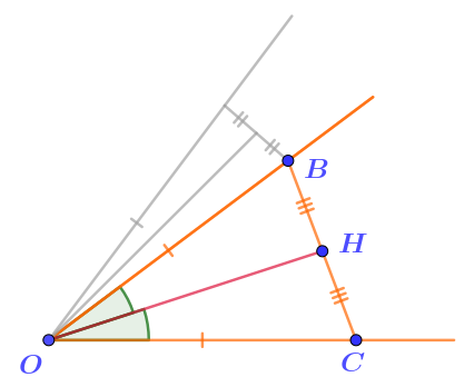 По свойству, \(\displaystyle OH\)– биссектриса треугольника \(\displaystyle BOC\), тогда