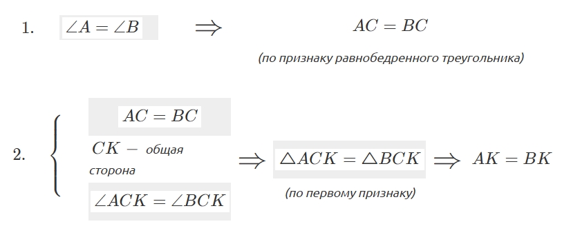 | \(\displaystyle CK\; -\) общая сторона | \(\displaystyle {\LARGE\Rightarrow}\) | \(\displaystyle {\LARGE\Rightarrow}\) | \(\displaystyle AK=BK\) | ||