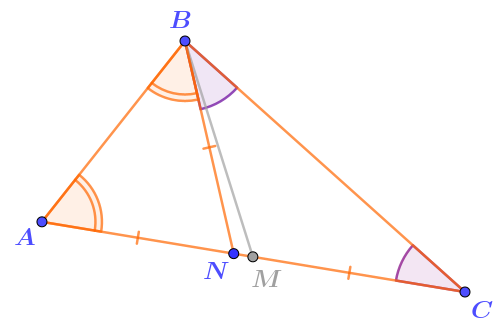 \(\displaystyle \angle ABN=\angle ABC-\angle CBN=\angle ABC-\frac{1}{3}\angle ABC=\frac{2}{3}\angle ABC=\angle A{\small .}\)