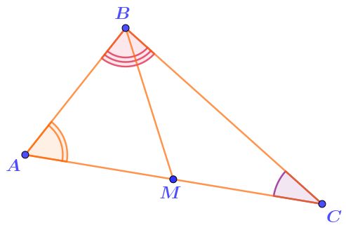 По условию, величина угла \(\displaystyle C\) составляет треть величины угла \(\displaystyle ABC{ \small ,}\) а величина угла \(\displaystyle A\; -\) две трети того же угла.