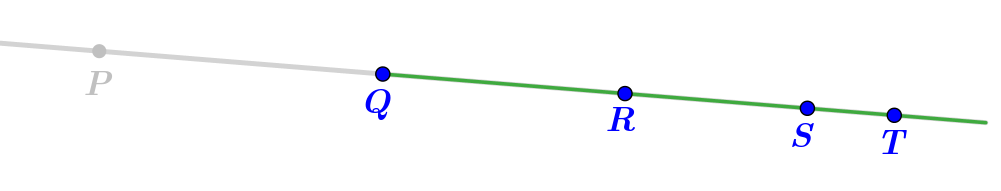 Луч \(\displaystyle QR\) содержит начало луча \(\displaystyle -\) точку \(\displaystyle Q\) и лежащие правее точки \(\displaystyle Q\) точки \(\displaystyle R,\,S,\,T{\small .}\)
