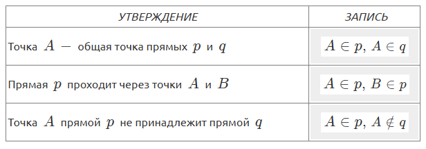- Принадлежность точки прямой может выражаться словами "точка прямой".