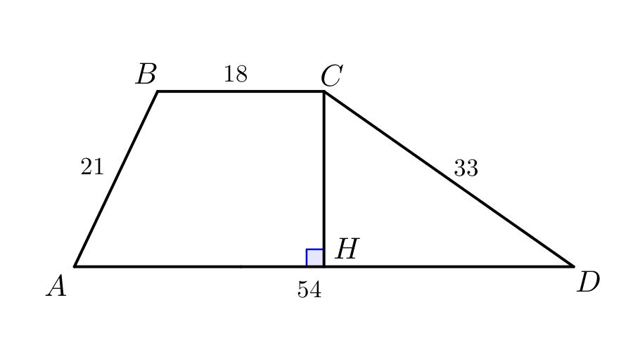 Найдите площадь трапеции с основаниями \(\displaystyle 54\) и \(\displaystyle 18\) и боковыми сторонами \(\displaystyle 21\) и \(\displaystyle 33\small.\)