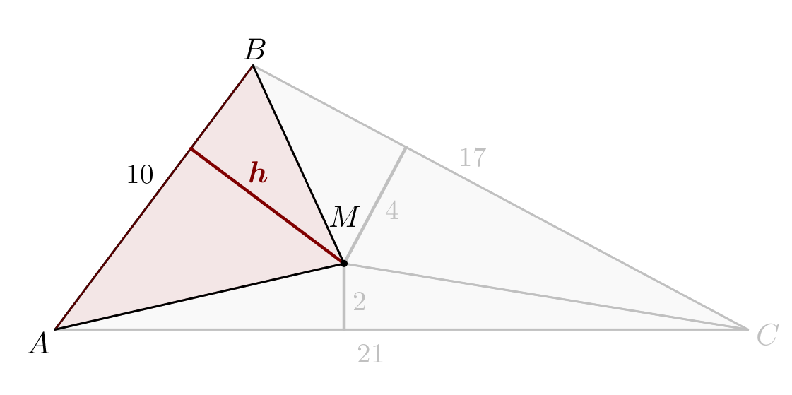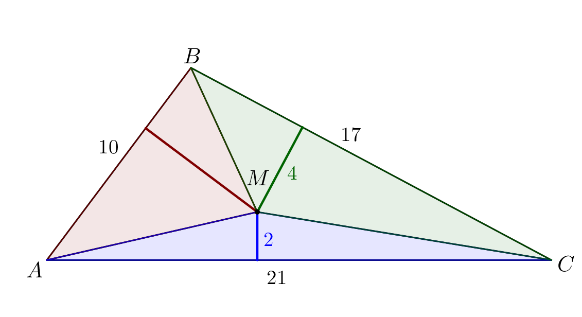 Внутри треугольника \(\displaystyle ABC\) со сторонами \(\displaystyle AB=10,\,AC=21,\,BC=17\) отметили точку \(\displaystyle M\small.\) Оказалось, что расстояние от точки \(\displaystyle M\) до стороны \(\displaystyle AC\) равно \(\displaystyle 2\small,\) а до стороны \(\displaystyle BC\) равно \(\displaystyle 4\small.\) Найдите расстояние от точки \(\displaystyle M\) до прямой \(\displaystyle AB\small.\)
