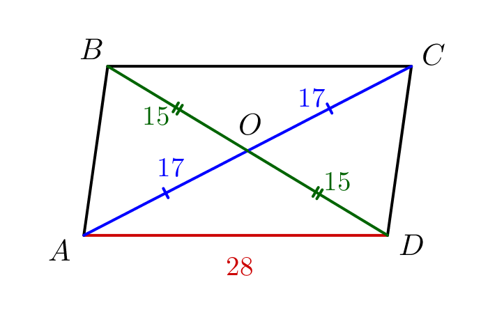 Найдите площадь параллелограмма, если одна из его сторон равна \(\displaystyle 28\small,\) а диагонали равны \(\displaystyle 30\) и \(\displaystyle 34\small.\)