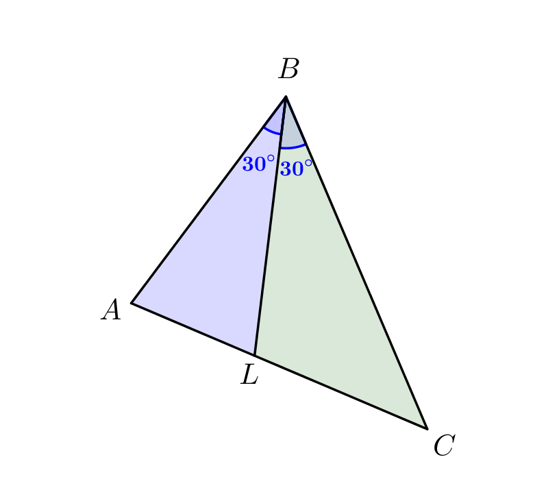 Биссектриса \(\displaystyle BL\) угла \(\displaystyle ABC\) делит его пополам, тогда \(\displaystyle \angle ABL=\angle CBL=\frac{60^{\circ}}{2}=30^{\circ}\small.\) Треугольник \(\displaystyle ABC\) состоит из двух треугольников: \(\displaystyle ABL\) и \(\displaystyle CBL\small.\) Значит, \(\displaystyle S_{ABC}=\color{blue}{S_{ABL}}+\color{green}{S_{CBL}}\small.\) | ![]() |