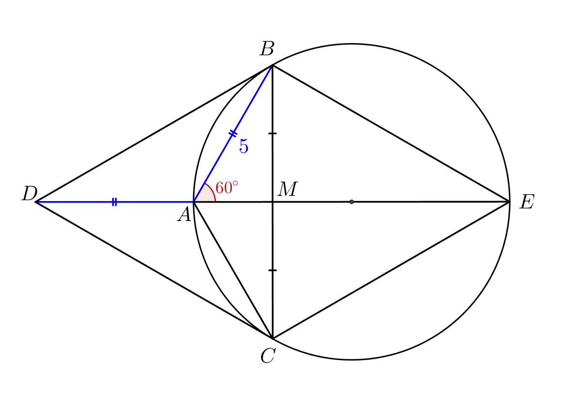 Вокруг треугольника \(\displaystyle ABC\) описана окружность. Продолжение медианы \(\displaystyle AM\) пересекает окружность в точке \(\displaystyle E\small.\) Известно, что \(\displaystyle AB=5,\,ME=AB+AM\) и \(\displaystyle \angle BAM=60^{\circ}\small.\) Найдите площадь треугольника \(\displaystyle ABC\small.\)