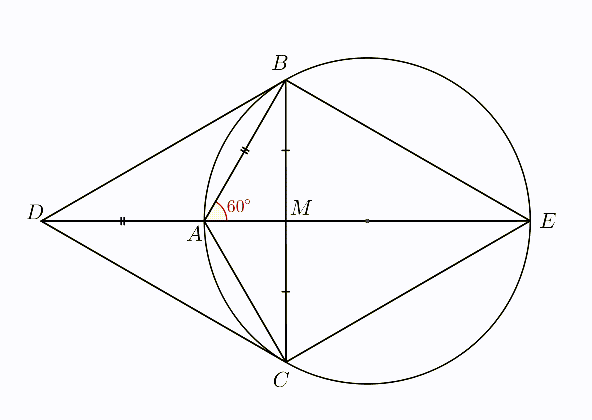 На продолжении отрезка \(\displaystyle EA\) за точку \(\displaystyle A\) отметим точку \(\displaystyle D\) так, что \(\displaystyle AD=AB\small.\) Рассмотрим четырехугольник \(\displaystyle DBEC\small.\) Поскольку \(\displaystyle ME=AB+AM=AD+AM=MD\small,\) то в четырехугольнике \(\displaystyle DBEC\) диагонали делятся точкой пересечения пополам. | ![]() |