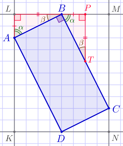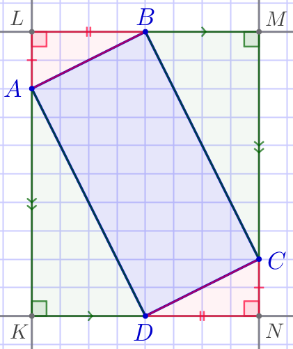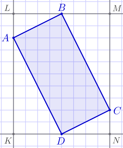 Впишем данный четырёхугольник \(\displaystyle ABCD\) в прямоугольник \(\displaystyle KLMN{\small,}\) образованный линиями сетки. | ![]() |