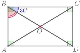 По определению, в прямоугольнике все углы прямые. При этом \(\displaystyle \color{green}{\angle ABC}=\color{red}{\angle ABD}+\color{blue}{ \angle CBD}{\small.}\) Выразим угол \(\displaystyle ABD{\small:}\) \(\displaystyle \color{red}{\angle ABD}=\color{green}{\angle ABC}- \color{blue}{ \angle CBD}{\small.}\) Подставим \(\displaystyle \angle ABC=90^{\circ}{\small,}\) \(\displaystyle \angle CBD=36^{\circ}{\small:}\) \(\displaystyle \color{red}{\angle ABD}=\color{green}{90^{\circ}}-\color{blue}{36^{\circ}}=\color{red}{54^{\circ}}{\small.}\) | ![]() |