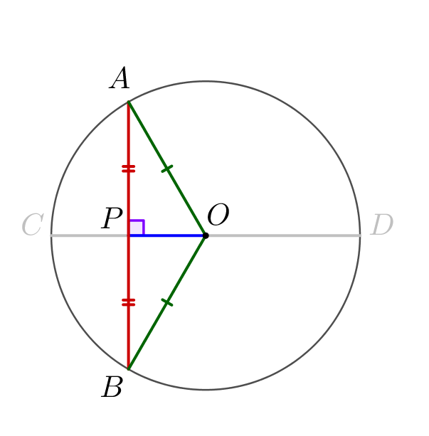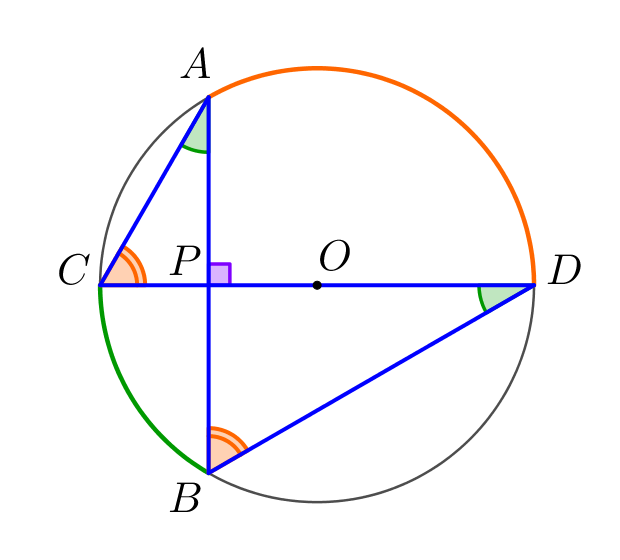 Пусть пересечение хорды \(\displaystyle AB\) и диаметра \(\displaystyle CD\) – точка \(\displaystyle P\small.\) Вписанные углы, опирающиеся на одну дугу окружности, равны. Отметим равные углы: \(\displaystyle \angle CAB=\angle CDB\) и \(\displaystyle \angle ACD=\angle ABD\small.\)