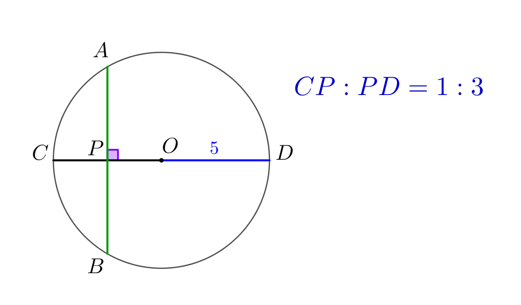 Хорда \(\displaystyle AB\small\) перпендикулярна диаметру \(\displaystyle CD\) окружности радиуса \(\displaystyle 5\small.\) Найдите длину хорды \(\displaystyle AB\small,\) если она делит \(\displaystyle CD\) в отношении \(\displaystyle 1:3\small.\)