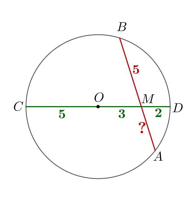 Через точку \(\displaystyle M\small,\) лежащую внутри окружности радиуса \(\displaystyle 5\) с центром \(\displaystyle O\small,\) провели хорду \(\displaystyle AB\small.\) Найдите \(\displaystyle MA\small,\) если \(\displaystyle MB=5\) и \(\displaystyle OM=3\small.\)