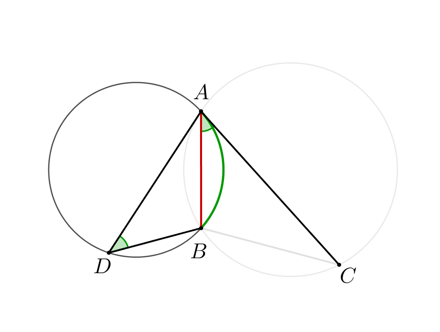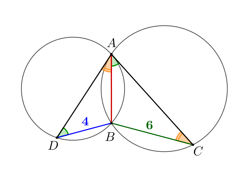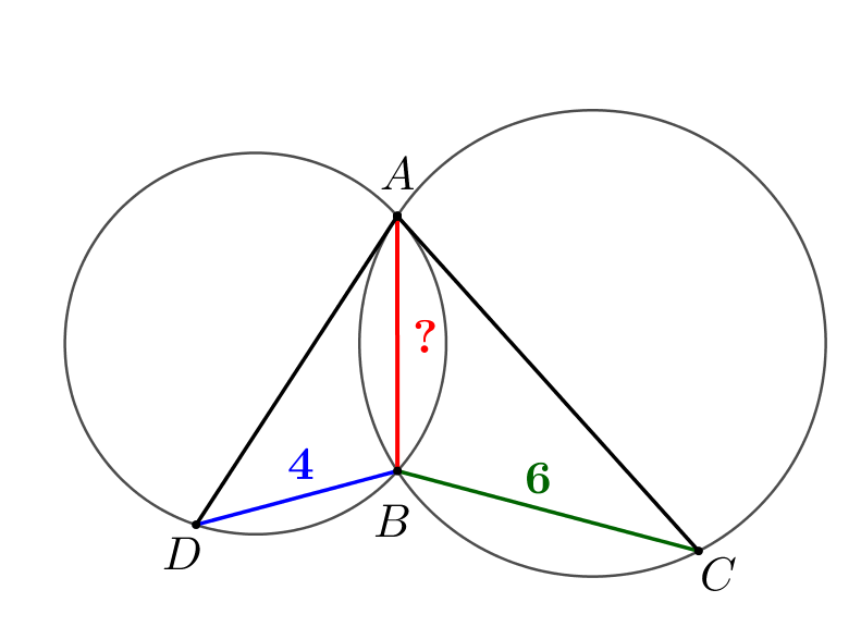 Две окружности пересекаются в точках \(\displaystyle A\) и \(\displaystyle B\small.\) Проведены хорды \(\displaystyle AC\) и \(\displaystyle AD\) этих окружностей так, что хорда одной окружности касается другой окружности. Найдите \(\displaystyle AB\small,\) если \(\displaystyle CB = 6,\, DB = 4\small.\)