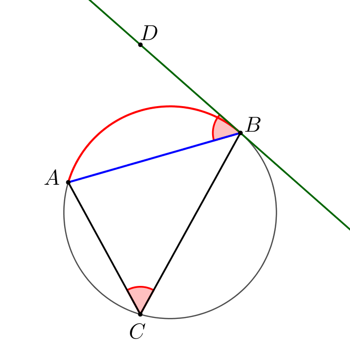 • \(\displaystyle AD\) – касательная, значит, \(\displaystyle \angle DAB=\angle ACB\small.\)