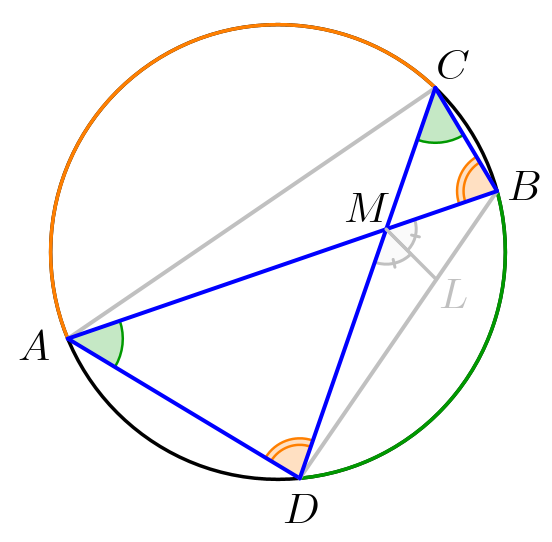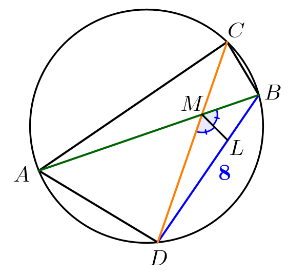 В окружности проведены хорды \(\displaystyle AB\) и \(\displaystyle CD\small,\) пересекающиеся в точке \(\displaystyle M\small.\) Точка \(\displaystyle L\) – точка пересечения биссектрисы угла \(\displaystyle BMD\) с хордой \(\displaystyle BD\small.\) Найдите отрезки \(\displaystyle BL\) и \(\displaystyle LD\small,\) если \(\displaystyle BD=8\small,\) а площади треугольников \(\displaystyle CMB\) и \(\displaystyle AMD\) относятся как \(\displaystyle 1:4\small.\)