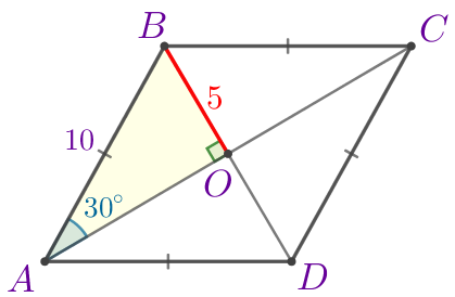 Сторона ромба \(\displaystyle ABCD\) равна \(\displaystyle 10{\small,}\) \(\displaystyle O\) – точка пересечения диагоналей \(\displaystyle AC\) и \(\displaystyle BD\) данного ромба. Найдите длину отрезка \(\displaystyle BO{\small,}\) если \(\displaystyle \angle BAO=30^{\circ}.\)