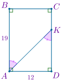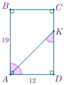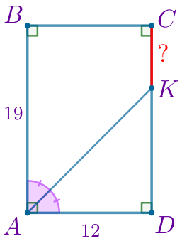 В прямоугольнике \(\displaystyle ABCD\) \(\displaystyle AB=19\, {\footnotesize см}{\small,}\) \(\displaystyle AD=12\, {\footnotesize см}{\small.}\) Биссектриса угла \(\displaystyle A\) пересекает сторону \(\displaystyle CD\) в точке \(\displaystyle K{\small.}\) Найдите длину отрезка \(\displaystyle CK{\small.}\)