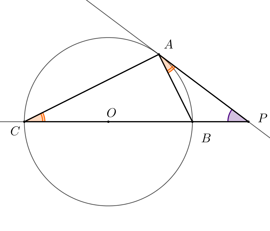 Угол между хордой и касательной равен вписанному углу, опирающемуся на данную хорду: \(\displaystyle \angle PAB=\angle BCA\small.\)