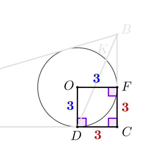 Проведем отрезки \(\displaystyle OD\) и \(\displaystyle OF\small.\) Поскольку радиус перпендикулярен касательной, то \(\displaystyle \angle CFO=\angle CDO=90^{\circ}\small.\) Тогда в четырехугольнике \(\displaystyle CDOF\) три прямых угла. Значит, это прямоугольник. При этом у этого четырехугольника две смежные стороны равны: \(\displaystyle OD=OF=r=3\small.\) Значит, это квадрат и \(\displaystyle OD=OF=CF=CD=3\small.\) | ![]() |