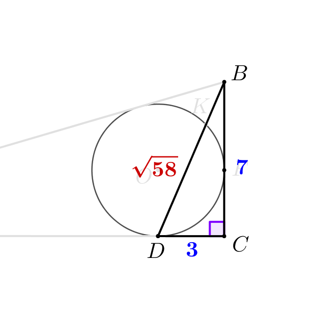 \(\displaystyle KD=BD-BK=\sqrt{58}-\frac{16}{\sqrt{58}}=\frac{58-16}{\sqrt{58}}=\frac{42}{\sqrt{58}}=\frac{21\sqrt{58}}{29}\small.\)