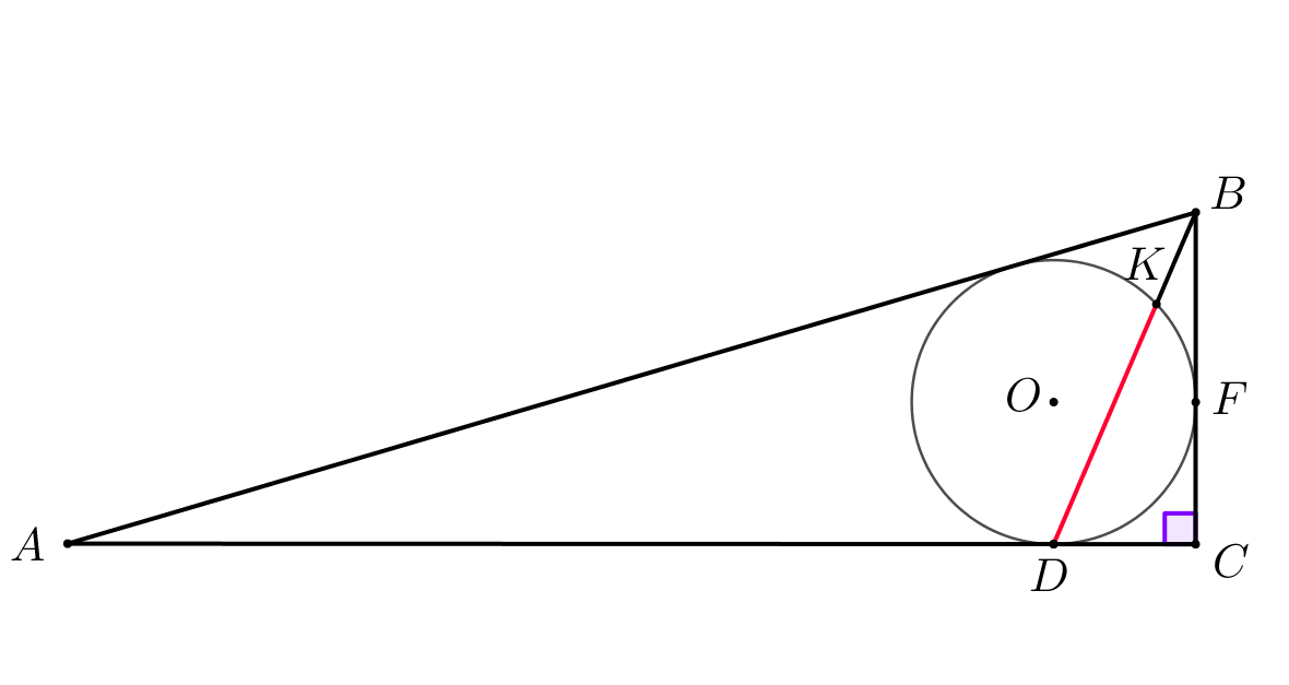 Точка \(\displaystyle O\) – центр вписанной окружности. Вписанная окружность касается стороны \(\displaystyle BC\) в точке \(\displaystyle F\small.\) Пересечение вписанной окружности и прямой \(\displaystyle BD\) – точка \(\displaystyle K\small.\) Необходимо найти \(\displaystyle KD\small.\) Тогда, чтобы решить задачу, найдем \(\displaystyle BD\) и \(\displaystyle BK\small.\) | ![]() |