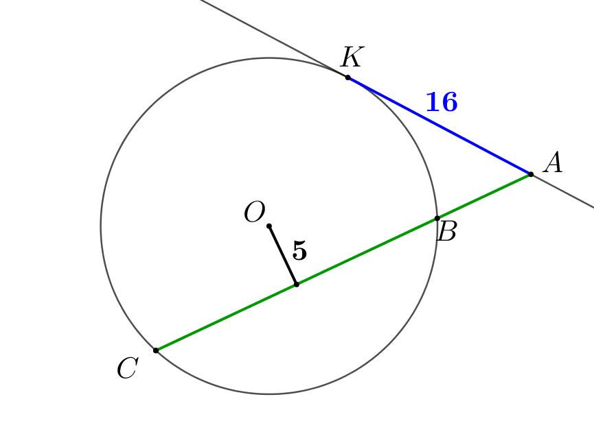 Из точки \(\displaystyle A\small,\) лежащей вне окружности, проведены к окружности касательная и секущая. Расстояние от точки \(\displaystyle A\) до точки касания равно \(\displaystyle 16\small,\) а расстояние от точки \(\displaystyle A\) до одной из точек пересечения секущей с окружностью равно \(\displaystyle 32\small.\) Найдите радиус окружности, если расстояние от центра окружности до секущей равно \(\displaystyle 5\small.\)