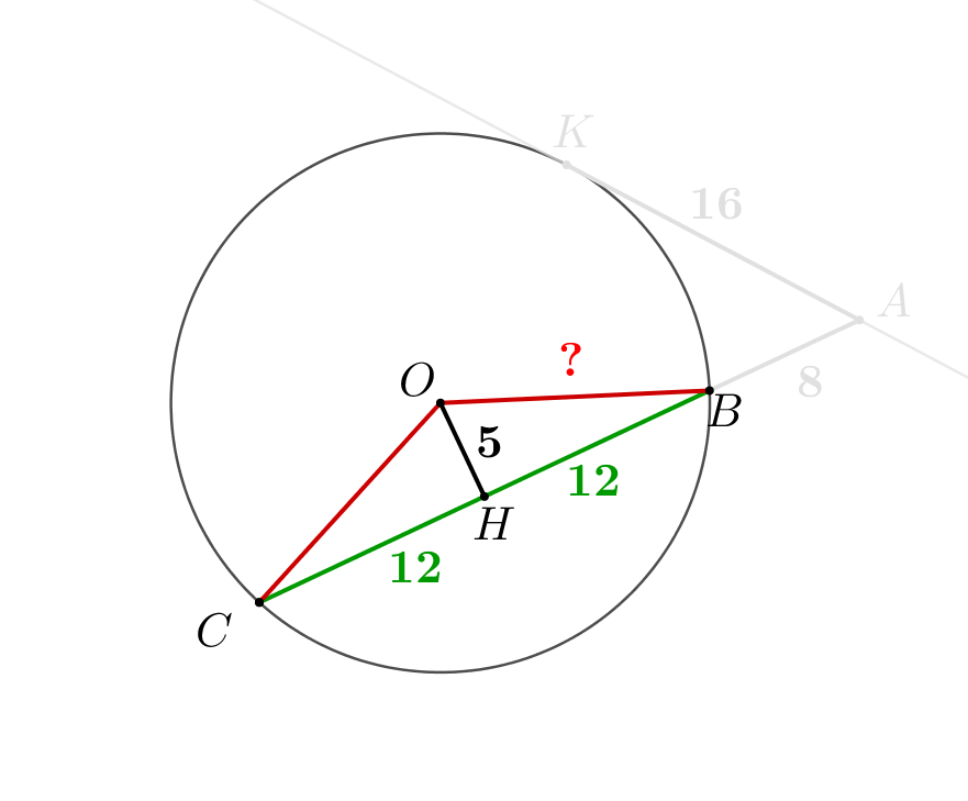 Рассмотрим треугольник \(\displaystyle OBC\small.\) Он равнобедренный, так как \(\displaystyle OB=OC\small.\) Проведем в нем высоту \(\displaystyle OH\small.\) Поскольку треугольник равнобедренный, \(\displaystyle OH\) также является медианой: \(\displaystyle BH=CH=\frac{BC}{2}=12\small.\) По условию, расстояние от \(\displaystyle O\) до секущей равно \(\displaystyle 5\small.\) То есть \(\displaystyle OH=5\small.\) Тогда в прямоугольном треугольнике \(\displaystyle OBH\) катеты \(\displaystyle BH=12\) и \(\displaystyle OH=5\small.\) По теореме Пифагора находим гипотенузу: \(\displaystyle BO^2=OH^2+BH^2=5^2+12^2=169\small,\) \(\displaystyle BO=\sqrt{169}=13\small.\) | ![]() |