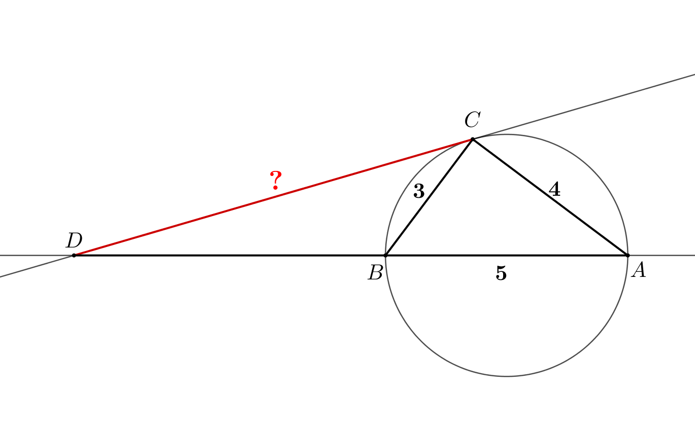 Через вершину наибольшего угла треугольника со сторонами \(\displaystyle 3,\,4,\,5\) проведена касательная к окружности, описанной около этого треугольника. Найдите отрезок касательной, заключенный между точкой касания и точкой пересечения с продолжением наибольшей стороны треугольника.