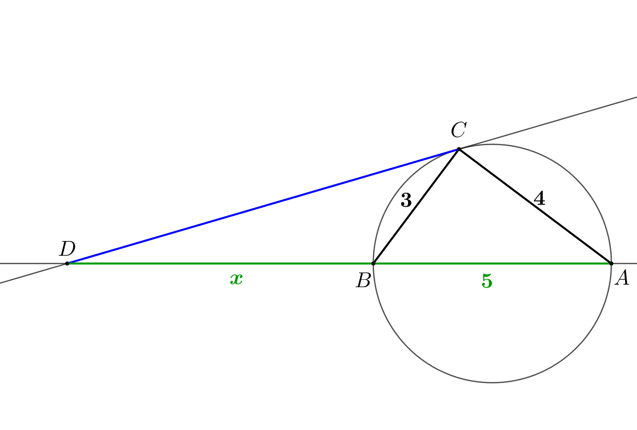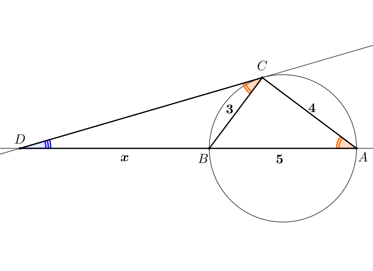 2. Установим еще одну зависимость между \(\displaystyle CD\) и \(\displaystyle x\small.\) Угол между хордой и касательной равен вписанному углу, опирающемуся на данную хорду: \(\displaystyle \angle DCB=\angle BAC\small.\) | ![]() |