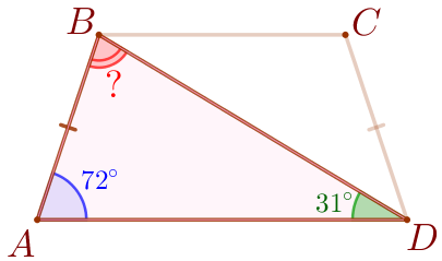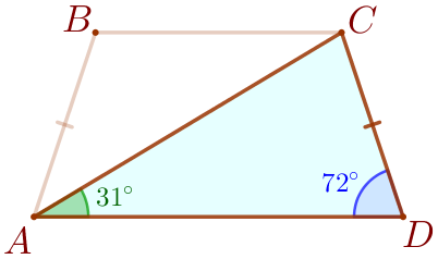 В равнобедренной трапеции \(\displaystyle ABCD\) с основаниями \(\displaystyle AD\) и \(\displaystyle BC\) угол \(\displaystyle BAD\) равен \(\displaystyle 72^{\circ}{\small,}\) угол \(\displaystyle CAD\) равен \(\displaystyle 31^{\circ}{\small.}\) Найдите угол \(\displaystyle ABD{\small.}\) Ответ дайте в градусах.