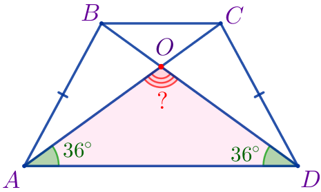 В равнобедренной трапеции \(\displaystyle ABCD\) с основаниями \(\displaystyle AD\) и \(\displaystyle BC\) угол \(\displaystyle CAD\) равен \(\displaystyle 36^{\circ }{\small,}\) \(\displaystyle O\) – точка пересечения диагоналей. Найдите угол \(\displaystyle AOD{\small.}\) Ответ дайте в градусах.
