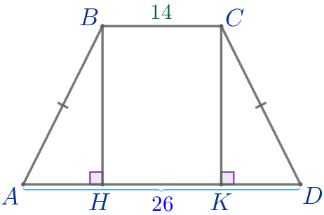 В равнобедренной трапеции \(\displaystyle ABCD\) основания \(\displaystyle BC\) и \(\displaystyle AD\) равны соответственно \(\displaystyle 14\) и \(\displaystyle 26{\small.}\) Высоты \(\displaystyle BH\) и \(\displaystyle CK\) делят большее основание на три отрезка. Найдите длину меньшего из полученных отрезков.