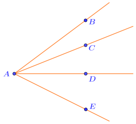 На четырёх лучах с общим началом \(\displaystyle A\) отмечены четыре точки.
