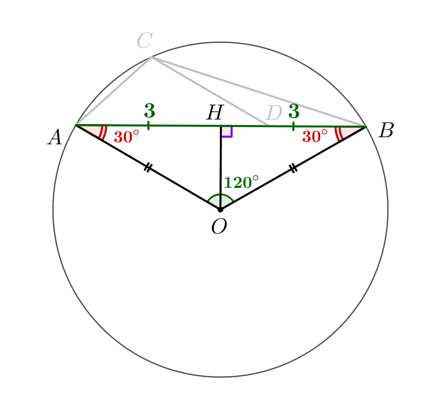 Рассмотрим треугольник \(\displaystyle ABO\small.\) Центральный угол \(\displaystyle AOB\) опирается на дугу \(\displaystyle 120^{\circ}\small,\) то есть \(\displaystyle \angle AOB=120^{\circ}\small.\) Треугольник \(\displaystyle AOB\) равнобедренный, так как радиусы равны: \(\displaystyle AO=BO\small.\) Тогда \(\displaystyle \angle ABO=\angle BAO=(180^{\circ}-120^{\circ}):2=30^{\circ}\small.\) Проведем высоту \(\displaystyle OH\) треугольника \(\displaystyle AOB\small.\) Поскольку треугольник \(\displaystyle AOB\) равнобедренный, то \(\displaystyle H\) еще середина стороны: \(\displaystyle AH=BH=\frac{AB}{2}=\frac{4+2}{2}=3\small.\) Следовательно, в прямоугольном треугольнике \(\displaystyle AHO{\small:}\) \(\displaystyle AO=\frac{AH}{\cos30^{\circ}}=3:\frac{\sqrt{3}}{2}=2\sqrt{3}\small.\) | ![]() |