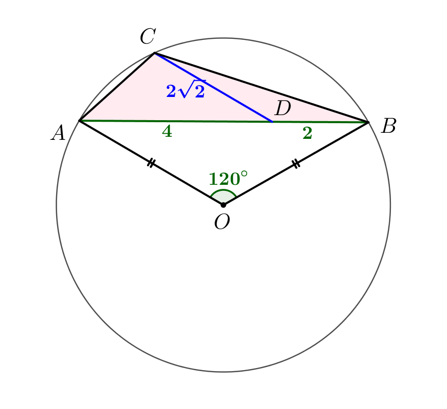 Хорда \(\displaystyle AB\) стягивает дугу окружности, равную \(\displaystyle 120^{\circ}\small.\) На этой дуге выбрали точку \(\displaystyle C\small,\) а на хорде \(\displaystyle AB\) выбрали точку \(\displaystyle D\small.\) При этом \(\displaystyle AD=4,\,BD=2,\,DC=2\sqrt{2}\small.\) Найдите площадь треугольника \(\displaystyle ABC\small.\)