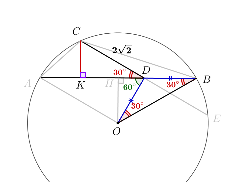 Проведем \(\displaystyle CK\) – высоту треугольника \(\displaystyle ABC{\small.}\) Найдем угол \(\displaystyle CDK\small.\) Поскольку \(\displaystyle BD=OD=2{ \small ,}\)то треугольник \(\displaystyle DBO\) равнобедренный и \(\displaystyle \angle DOB=\angle DBO=30^{\circ}\small.\) Внешний угол этого треугольника \(\displaystyle \angle ADO=30^{\circ}+30^{\circ}=60^{\circ}\small.\) Поскольку \(\displaystyle \angle CDO=90^{\circ}\small,\) то \(\displaystyle \angle ADC=\angle CDO-\angle ADO=90^{\circ}-60^{\circ}=30^{\circ}\small.\) Тогда в прямоугольном треугольнике \(\displaystyle CDK\) острые углы \(\displaystyle 30^{\circ},\,60^{\circ}\small.\) В таком прямоугольном треугольнике сторона, лежащая напротив угла в \(\displaystyle 30^{\circ}{ \small ,}\) в два раза короче гипотенузы: \(\displaystyle CK=\frac{CD}{2}=\frac{2\sqrt{2}}{2}=\sqrt{2}\small.\) | ![]() |