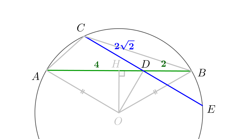 Через точку \(\displaystyle D\) проходят хорды \(\displaystyle AB\) и \(\displaystyle CE\small.\) Произведение отрезков пересекающихся хорд равны. Тогда \(\displaystyle AD\cdot BD=CD\cdot DE\small.\) Подставляя известные значения \(\displaystyle AD=4,\,BD=2,\,CD=2\sqrt{2}\small,\) получаем \(\displaystyle 4\cdot2=2\sqrt{2}\cdot DE\small,\) \(\displaystyle DE=\frac{4\cdot2}{2\sqrt{2}}=2\sqrt{2}\small.\) | ![]() |