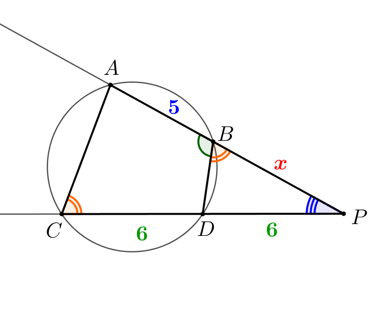 Из точки\(\displaystyle P\small,\)лежащей вне окружности, провели две секущие. Одна секущая пересекает окружность в точках\(\displaystyle A\)и\(\displaystyle B\small,\)другая в точках\(\displaystyle C\)и\(\displaystyle D\small.\)Найдите \(\displaystyle PA\small,\)если\(\displaystyle AB=5{ \small ,}\,DC=PD=6{ \small ,} \,PB<PA\small.\)