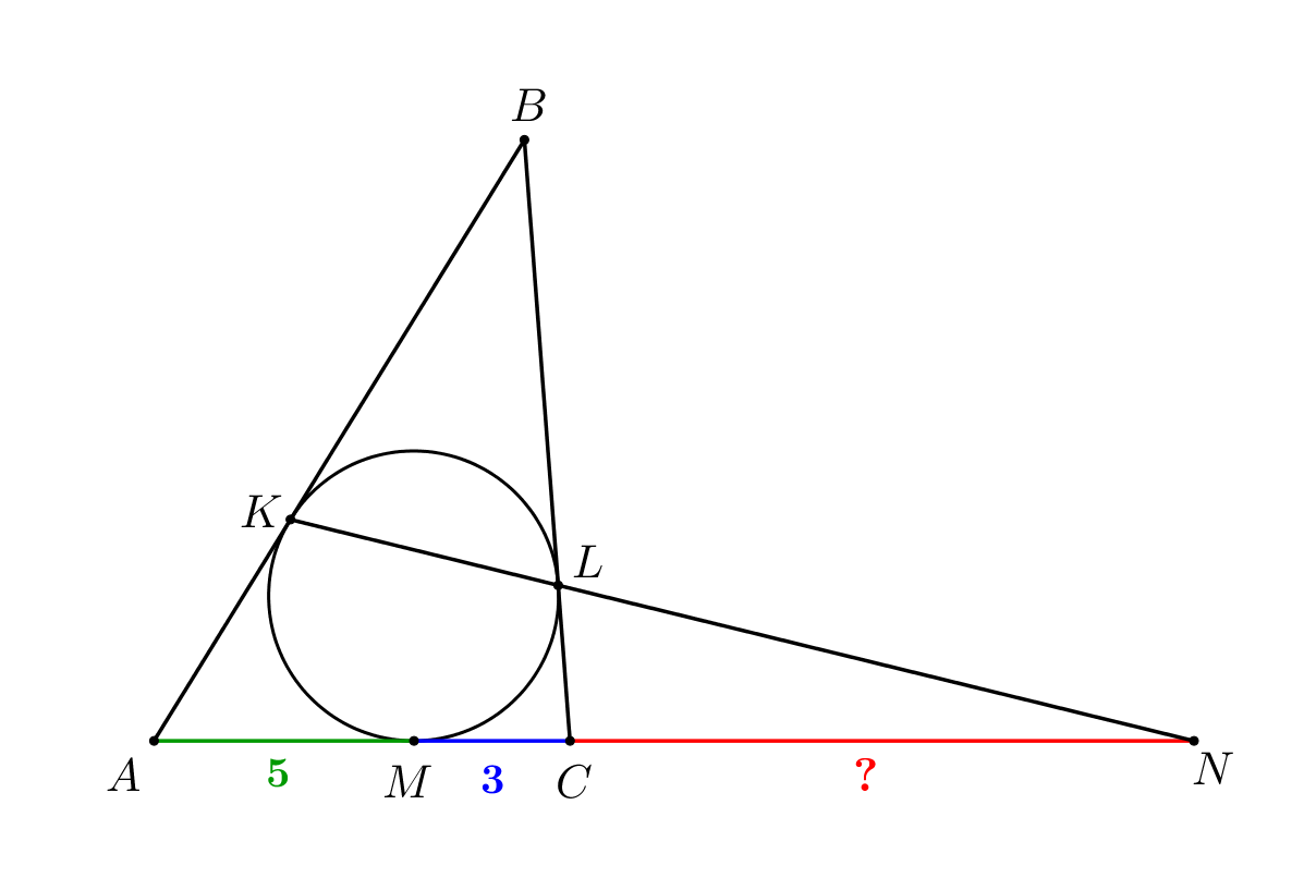 Вписанная окружность треугольника \(\displaystyle ABC\) касается его сторон \(\displaystyle AB,\,BC\) и \(\displaystyle AC\) в точках \(\displaystyle K,\,L\) и \(\displaystyle M\) соответственно. Прямая \(\displaystyle KL\) пересекает продолжение стороны \(\displaystyle AC\) в точке \(\displaystyle N{\small.}\)