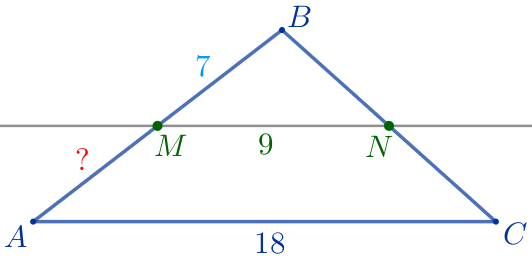 Прямая, параллельная стороне \(\displaystyle AC\) треугольника \(\displaystyle ABC{\small,}\) пересекает стороны \(\displaystyle AB\) и \(\displaystyle BC\) в точках \(\displaystyle M\) и \(\displaystyle N\) соответственно. Известно, что \(\displaystyle BM=7{\small,}\) \(\displaystyle AC=18{\small,}\) \(\displaystyle MN=9{\small.}\) Найдите \(\displaystyle AM{\small.}\)