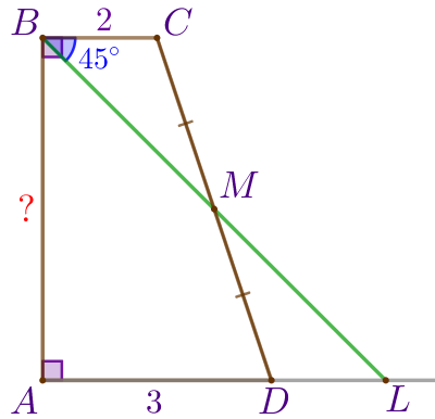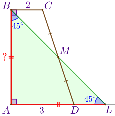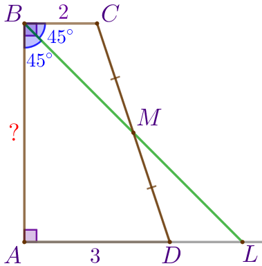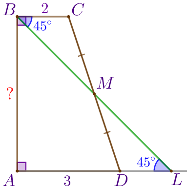 Из вершины прямого угла меньшего основания прямоугольной трапеции под углом \(\displaystyle 45^{\circ}\) к этому основанию проведён луч, который проходит через середину большей боковой стороны. Найдите меньшую боковую сторону этой трапеции, если её основания равны \(\displaystyle 2\) и \(\displaystyle 3{\small.}\)