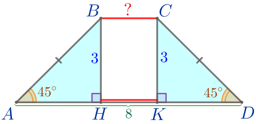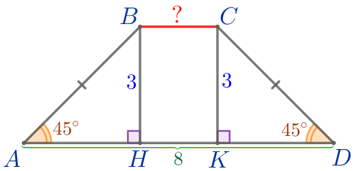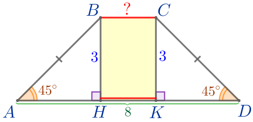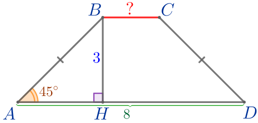 В равнобедренной трапеции высота равна \(\displaystyle 3{\small,}\) бóльшее основание равно \(\displaystyle 8{\small,}\) а угол при основании равен \(\displaystyle 45^{\circ}{\small.}\) Найдите меньшее основание трапеции.