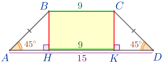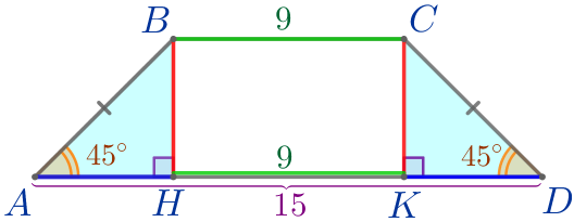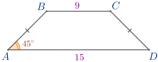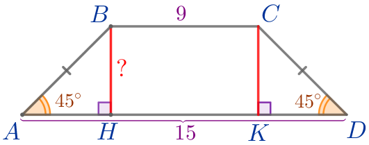 Основания равнобедренной трапеции равны \(\displaystyle 15\) и \(\displaystyle 9\small,\) один из углов равен \(\displaystyle 45^\circ\small.\) Найдите высоту трапеции.