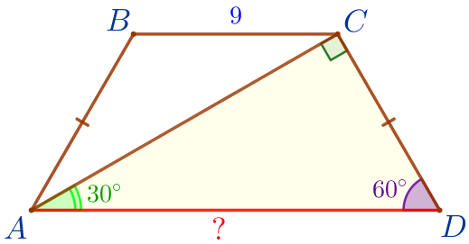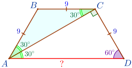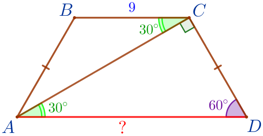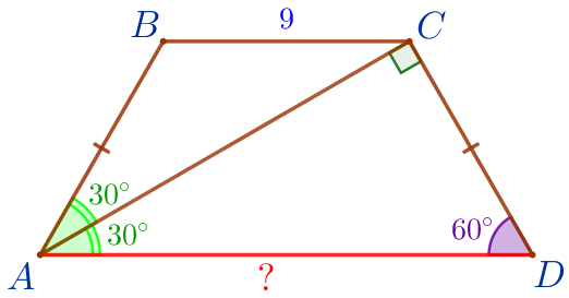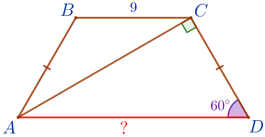 В равнобедренной трапеции \(\displaystyle ABCD\) с бóльшим основанием \(\displaystyle AD\) диагональ \(\displaystyle AC\) перпендикулярна к боковой стороне \(\displaystyle CD{\small.}\) Найдите \(\displaystyle AD{\small,}\) если \(\displaystyle BC=9\, \footnotesize см{\small,}\) а \(\displaystyle \angle D=60^{\circ}{\small.}\)