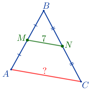 В треугольнике \(\displaystyle ABC\) точки \(\displaystyle M\) и \(\displaystyle N\) являются серединами сторон \(\displaystyle AB\) и \(\displaystyle BC\) соответственно. Найдите сторону \(\displaystyle AC{\small,}\) если \(\displaystyle MN=7{\small.}\)