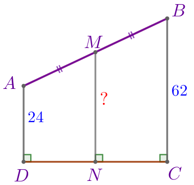 \(\displaystyle MN=\frac{AD+BC}{2}=\frac{24+62}{2}=\frac{86}{2}=43{\small.}\)